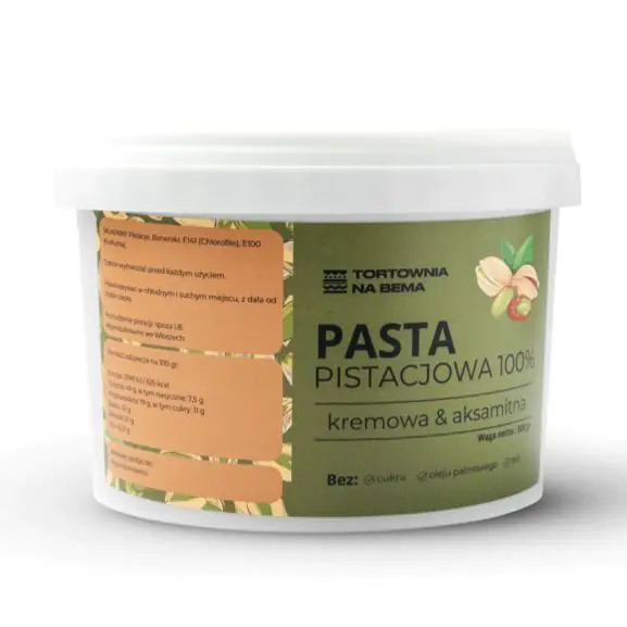 Pasta pistacjowa jest wysokiej jakości produkt składający się w 100% z pistacji pochodzących z Sycylii, uznawanych za jedne z najlepszych na świecie. Pasta ta jest idealna do wypieków i deserów, takich jak czekolada dubajska, sernik dubajski, desery dubajski, eklerki pistacjowe, tiramisu pistacjowe, Urszi Brest, cakesicles pistacja-malina oraz jako wsad do makaroników.