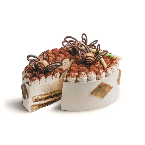Puszyste paluszki biszkoptowe savoiardi nasączone ponczem z esencjonalną kawą i przełożony lekką masą waniliową śmietankową na bazie żółtek i sera mascarpone. Wierzch obsypany kakao i udekorowany czekoladą.