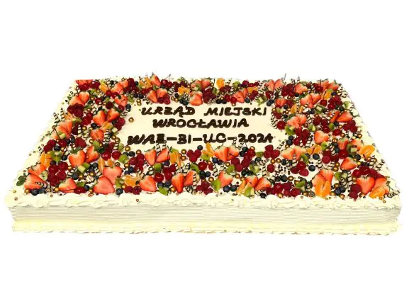 Ten wyjątkowy tort firmowy z owocami to połączenie świeżości i elegancji. Całość ozdobiona jest delikatnymi plasterkami owoców oraz eleganckim, ręcznie wykonanym napisem firmowym lub dedykowanym przesłaniem. Ten tort nie tylko zachwyca smakiem, ale również prezentuje się bardzo efektownie. Doskonały na różnego rodzaju uroczystości firmowe i spotkania biznesowe, ten tort z pewnością zrobi wrażenie na wszystkich gościach i partnerach biznesowych.