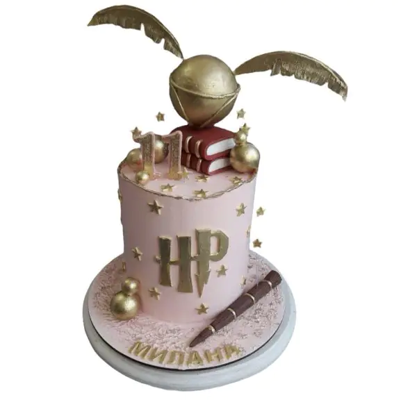 Wkrocz do świata magii z tym tortem inspirowanym Harrym Potterem. Udekorowany złotymi zniczami, księgami zaklęć, różdżkami i gwiazdami, to ciasto jest koniecznością na urodzinach każdego młodego czarodzieja lub czarownicy. Wykończony metalicznymi akcentami i kultowym herbem „HP”, ten tort przeniesie Twoją imprezę prosto do Hogwartu!