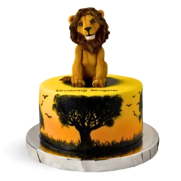 To urzekające ciasto ożywia dzikie piękno afrykańskiej sawanny. Uwieńczone ręcznie wykonaną figurą lwa siedzącego dumnie, ciasto przedstawia oszałamiającą scenę zachodu słońca z drzewami akacjowymi i ptakami w sylwetkach. Idealne dla tych, którzy kochają nieokiełznanego ducha natury, to ciasto jest zarówno wizualną, jak i smakową rozkoszą.