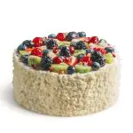 Tort z jasnymi biszkoptami warstwami z kremu śmietankowego i warstwą owocowej galaretki. Udekorowany świeżymi owocami i białą czekoladą.