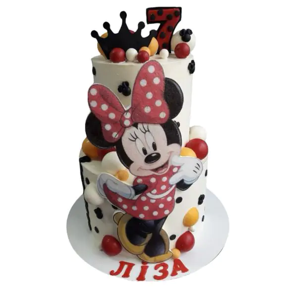 Urodzinowy tort inspirowany ulubioną myszką każdej dziewczynki – Minnie Mouse! Dwupiętrowy tort zdobi duża figura Minnie, która zachwyca swoimi charakterystycznymi czerwonymi groszkami. Ozdoby w postaci koronki oraz kulek sprawiają, że ten tort jest prawdziwym hitem na każdym dziecięcym przyjęciu urodzinowym.