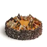 Tort mus mango realizowany na bazie sufle śmietankowym i kawałkami brzoskwini u góry wypełniony musem z mango i udekorowany czekoladą.