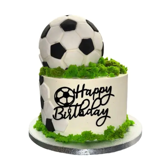 Ten wyjątkowy tort to marzenie każdego fana piłki nożnej! Biało-czarna piłka wykonana z delikatnej masy cukrowej zdobi szczyt tortu, który otacza dekoracyjna “trawa” z zielonego biszkoptu. Idealny wybór na urodziny miłośnika sportu.