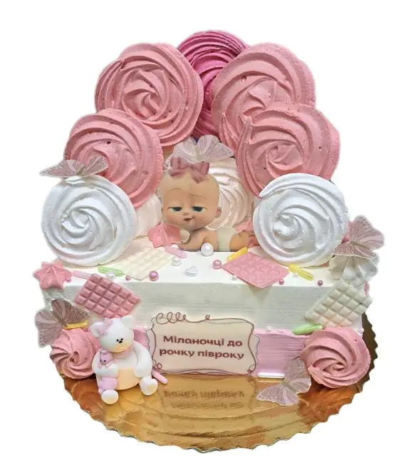 Tort połówka na roczek dla dziewczynki to urocze cudo pełne słodkości i kolorów. Delikatny róż i pastelowe odcienie tworzą romantyczną oprawę dla tej wyjątkowej okazji. Tort jest ozdobiony słodkimi dekoracjami, takimi jak cukrowe lizaki, bezy, czekoladki, nadruki jadalne i figurki z masy cukrowej, motylki. Każdy kawałek to mała eksplozja smaków – puszyste biszkopty i lekka, kremowa nuta. To doskonały wybór na pierwsze urodziny, dodając uroku i słodyczy do tego wyjątkowego dnia.