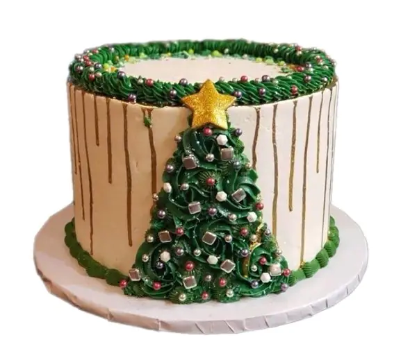 Świąteczny tort ozdobiony kremową dekoracją i delikatnie ukrytą w centrum – piękną choinką z kremu.