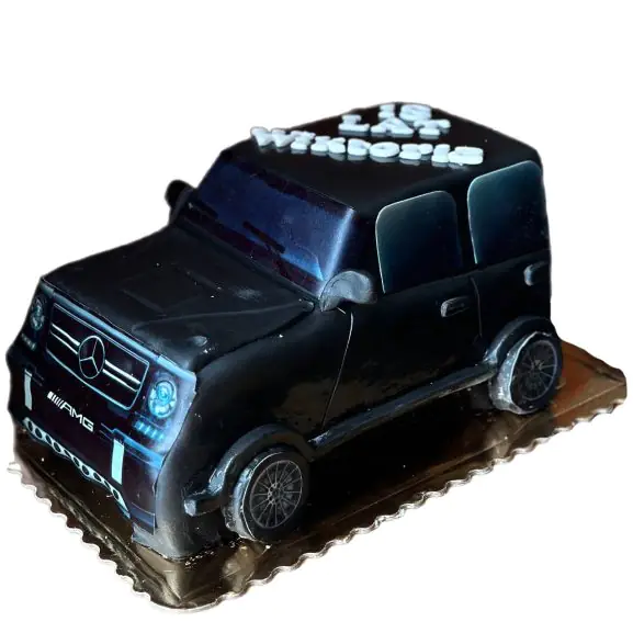 Tort pokryty delikatnym lukrem, oddaje charakterystyczną sylwetkę Mercedesa Klasy G. Szczegółowo wykonane elementy z nadruków jadalnych, takie jak reflektory czy chromowane akcenty, dodają tortowi wyjątkowego blasku i efektu.