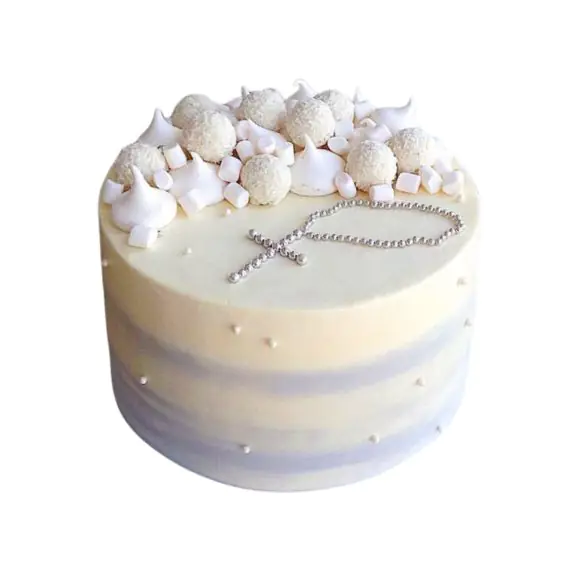 Nasz delikatny tort konfirmacyjny to idealny wybór na wyjątkową okazję jak komunia. Na szczycie tortu umieszczony jest krzyż, symbolizujący duchową podróż i wzrost wiary. Dodatkowo, ozdobne bezowe rosetki otaczające tort nadają mu elegancji i lekkości. To wyrafinowany deser, który uświetni uroczystość i dostarczy niezapomnianych doznań smakowych.