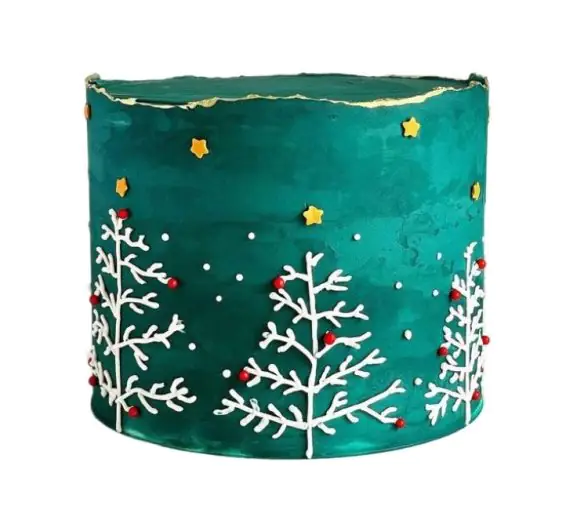 Świąteczny tort wyróżniający się dekoracją delikatnych choinek. Delikatne, kremowe gałązki z kolorowymi ozdobami, doskonale komponują się z delikatnym smakiem ciasta. Wyjątkowy w swojej prezencji, zachwycający każdego smakosza słodyczy.